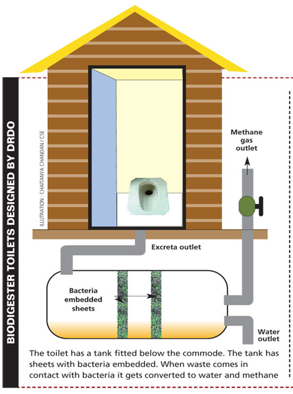 Bio toilets use bacteria developed by Defence Research & Development Organization to digest the fecal matter and convert it into odourless fertile water, methane and carbon dioxide. The technology is self-sustaining: the anaerobic bacteria will survive and grow without oxygen inside the bio-tank and does not require replenishment.